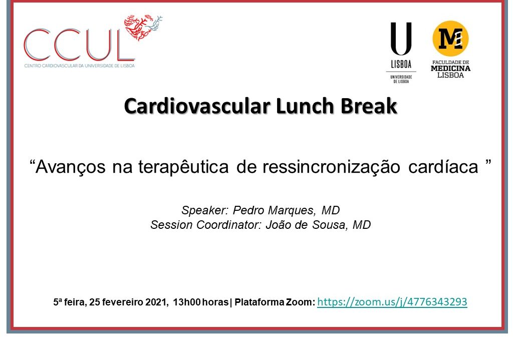Cardiovascular Lunch Break by Isabel Roque | Feb 25, 2021 | Previous Events | 0 comments Avanços na terapêutica de ressincronização cardíaca Speaker: Pedro Marques, MD (CCUL) Organized by: CCUL