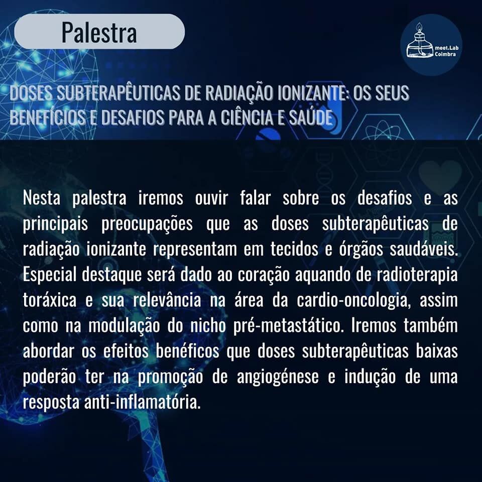 O CCUL@RISE participa hoje no VII meet Lab, na Universidade de Coimbra. O Meet Lab é um projeto organizado pelo Núcleo de Estudantes de Biologia da Associação Académica de Coimbra (NEB/AAC) que tem como principal objetivo a promoção de palestras e workshops que proporcionem aos participantes um enriquecimento da sua formação curricular, e favoreçam o seu interesse pelas diferentes áreas de investigação laboratorial.